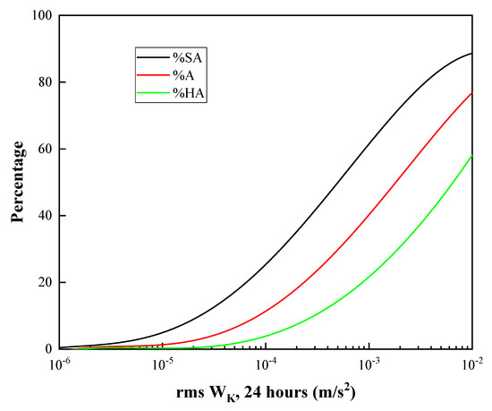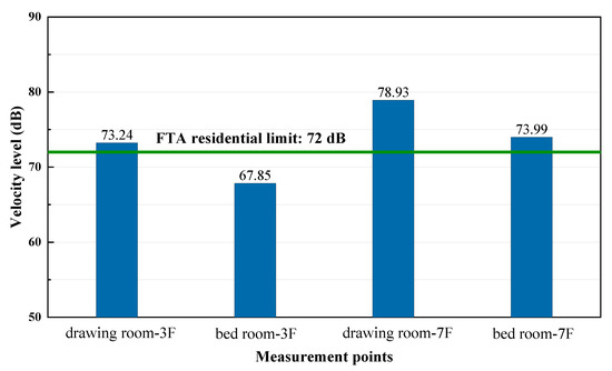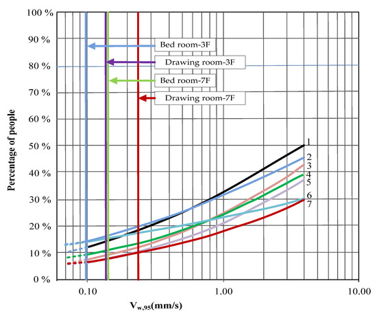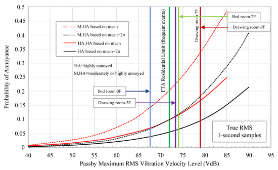 By using the calibration method, an engineering acceptable design level of vibration comfort corresponding to an allowable annoyance rate of 7% is obtained [33]. The vibration data of the third and seventh floors of the over-track buildings were analyzed and evaluated, using Equation (16).