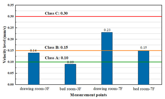Table 7 shows the results of νw,max and νw,95 on the seventh floor when the train passed through tracks 14–18. The νw,95 value in the drawing room was 0.23; considering the function of this room, the vibrations affected 19% of people watching TV or engaging in other sources of entertainment, 11% of people talking on the phone, and 18% of people talking to each other. The νw,95 value in the bedroom was 0.15; considering the function of this room, the vibrations affected 17% of people who were resting, and 9% of people experienced certain difficulties in sleeping. Figure 14 compares the train-induced vibration levels in the over-track building with the Norwegian standard vibration limits, where vibrations above Class B causes a certain level of vibration disturbance to residents; the living room and bedroom on the seventh floor exceed the limits of Class B.
