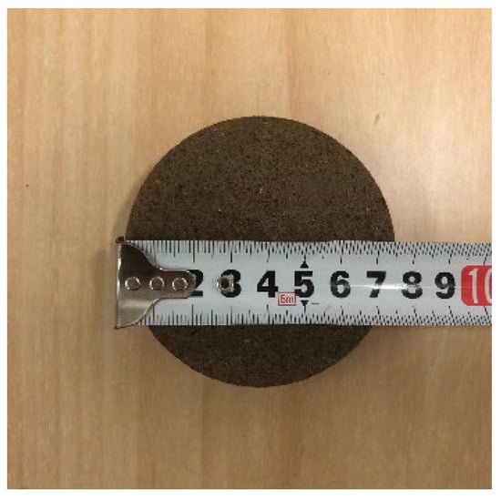 The earth materials were crushed and passed through a 2 mm sieve. The treated earth materials were dried in a constant temperature blast drying oven (DGG-9140A, accuracy: ± 0.1 °C) until the change in the mass was less than 0.1%, within 24 h. A precision electronic balance (JJ324BC, range: 0–320 g, accuracy: ±0.1 mg) was used to weigh the adequately dried earth materials. In accordance with the specification of the earth test [25], 13% water was added to the earth materials, mixed and stirred well, poured into a mold, and pressed into a cylinder (R = 0.078 m, L = 0.021 m) using a hydraulic press. Based on relevant specifications, Shang Jianli determined the standard value of compressive strength of the earth materials as 2.0 Mpa [26]. The density of the specimen in this experiment was 2100 kg/m3, which meets this requirement. Finally, the pressed specimens were placed at 20 ± 1 °C and 60 ± 1% RH for 28 d of curing (shown in Figure 1). The cured specimens were used for parameter testing.
