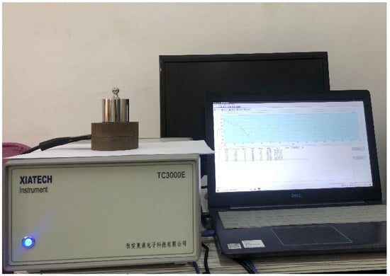 The moisture content of the rammed earth specimens was controlled using the weight moisture method. The expression for the moisture content is given by Equation (1). Water, with the corresponding moisture content of 2%, 4%, 6%, 8%, 10%, 12%, and 14% in sequence, was sprayed on the surface of the specimen after curing and drying. The specimen reached its plastic limit when its moisture content reached 16%; therefore, the data recorded thereafter was not considered [24]. Then, the specimen was wrapped fully with a plastic cling film, sealed, and cured for 12 h to ensure permeation of water evenly in the specimen. Finally, a thermal conductivity tester (TC-3000E, range: 0.001–10 W/mK, accuracy: ±3%) was used to measure the thermal conductivities of the specimens (Figure 2). Each specimen was measured three times to obtain the average values, which were recorded.
