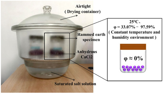 Twelve rammed earth specimens were prepared. Then, 50 g of anhydrous calcium chloride (CaCl2) was added to each sample cup. The completely dry rammed earth specimen was placed at the mouth of the cup, sealed with beeswax, and weighed. Finally, the sample cups were placed in drying containers with different saturated salt solutions. Relative humidity values corresponding to each saturated salt solution [28] are listed in Table 3. Two sample cups were placed in each drying container as a group, and the drying container was placed in an environmental control room (temperature: 25 ± 0.5 °C, relative humidity: 60 ± 2%). The weight of the sample cups was recorded every 24 h and the variation in weight was averaged for each group of sample cups. The recording was stopped if the average variation in weight over five consecutive weights was less than 5%.