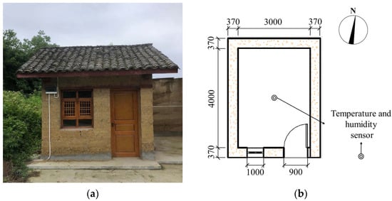 A newly built half-year-old rammed-earth building was used to measure the change in indoor temperature and humidity. The building size is 4 m × 3 m × 2.7 m, and the wall thickness is 370 mm. There is an outer door with a size of 2.0 m × 0.9 m and a single glass window with a size of 1.2 m × 1.0 m. There is no heat and humidity source in the room. The general situation of the building and the placement of temperature and humidity sensors are shown in Figure 5. The measurement data for one week in January were selected for model validation.