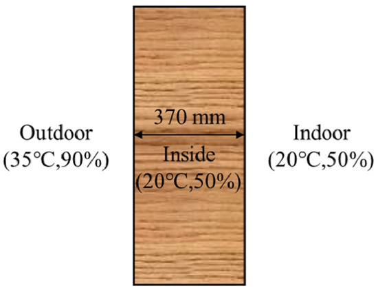 To study the influence of material hygrothermal parameters on the heat and moisture transfer of the rammed earth walls under steady boundary conditions, a 370-mm-thick rammed earth wall (Figure 7) was used as the object of study, and its heat and moisture transfer was simulated and calculated. It was assumed that the outdoor temperature and humidity were 35 °C and 90%, respectively, and the indoor was 20 °C and 50%, respectively. The initial state inside of the wall was the same as the indoors, and the calculated duration was 600 h.