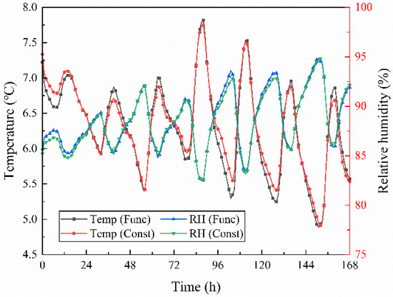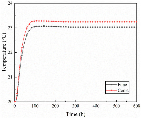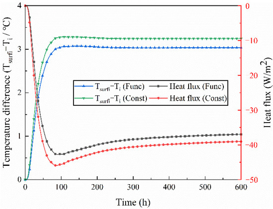 As shown in Figure 11, the temperature of the internal surface of the wall varies periodically with the indoor and outdoor temperature and humidity, and the temperature difference between the two conditions is small. In Case 1, the average temperature was 26.76 °C and 26.86 °C under the function and constant conditions, respectively, with a maximum temperature difference of 0.1 °C. In Case 2, the average temperature was 26.88 °C and 26.93 °C under the function and constant conditions, respectively, with a maximum temperature difference of 0.06 °C.