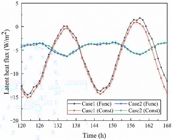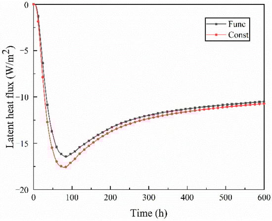 As shown in Figure 10, the internal surface of the wall released heat at a higher rate during the initial 85 h, with the latent heat flux rising faster and starting to decrease after 85 h. The latent heat flux on the internal surface under constant conditions was always greater than that under functional conditions, and the difference gradually increased and then began to stabilize. The average latent heat flux difference was 0.50 W/m2, with an average relative error of 6.07%. The reasons are as follows: the indoor air relative humidity was low, and the internal surface of the wall releases moisture. The water vapor permeability of the constant condition was greater than that of the functional condition, and the moisture release rate under constant conditions was greater. Meanwhile, the thermal conductivity under constant conditions was greater than that under functional conditions, which increases the difference in latent heat flux. As the moisture content inside the wall increases, the moisture release rate begins to decrease, as well as the moisture flux. The latent heat flux begins to decrease and the difference between the two conditions was stable.