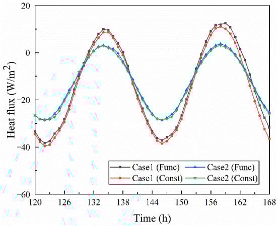 As shown in Figure 12, the negative values of heat flux indicate that the rammed earth wall releases heat, while the positive values indicate that heat is absorbed. In Case 1, the heat flux was 922.15 W/m2 under constant conditions, which is 4.65% higher than 881.14 W/m2 under functional conditions. In Case 2, the heat flux was 667.10 W/m2 under constant conditions, which is 2.02% higher than 653.88 W/m2 under functional conditions.