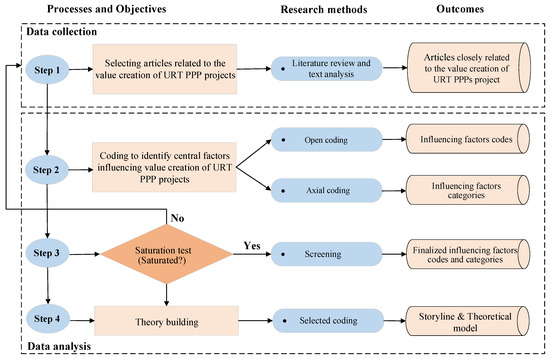 There are many practical cases and experience summaries of URT PPP projects in China. The qualitative research method has advantages in data information collection, data processing, and theory formation, which is suitable for exploratory research [22]. The grounded theory methodology is adopted in this study to explore the factors influencing the value creation of URT PPP projects and explain how these factors enable maximized joint value creation. The research process based on grounded theory methodology is shown in Figure 1, including data collection and data analysis parts.