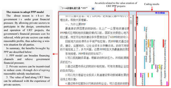 Open coding refers to the categorization of sentences or phrases in the texts and the procedure used to build the initial coding from the raw data by reading line-by-line or sentence-by-sentence [22]. Two principles must necessarily be complied with during the open coding process based on the data set of 522 articles to identify and depict overall constructs related to factors influencing the value creation of URT PPP projects [49]. First, the researcher needs to put aside subjective imagination and prejudice to obtain objective and rational concepts and categories. Then, a sentence-by-sentence analysis is conducted to trace continuously. “What is the relationship between the sentences and the research object?” and “What concept does this sentence provide?” One article (ID NO.2-14) is used as an example to present the open coding in Nvivo12, as shown in Figure 2. The left side of Figure 2 is the part of the NO.2-14 article, which is in Chinese. The right-side information is about the coding stripes with different colors. Two PhD graduates with a research focus on value creation of URT PPP projects undertook coding tasks separately to reduce coders′ subjective influence on the work result.