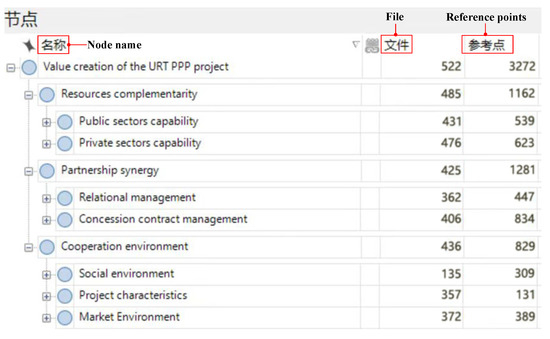 Based on the results of open coding, axial coding is adopted to discover and establish relationships between subcategories and main categories [22]. The main categories of nodes are often referred to as parent nodes. The others, including subcategories and concepts, are child nodes. A child node can only have one parent node and have different relations to the parent node. The purpose of axial coding in this study is to classify the relationship between each concept and obtain the factors influencing the value creation of the URT PPP project. During the classification process, a more abstract category level can be found through the repeated comparative and cluster analysis of the relationships of concepts obtained from open coding [24]. In Nvivo12, the tree-like hierarchical structure of nodes and their relationships with each other were established to present the connections between concepts, subcategories, and main categories. Figure 3 only shows parent codes and the sub-categories level of child nodes due to the length limitations of this article. The results of open coding and axial coding are shown in Section 4.1 for details.