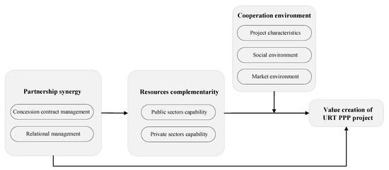 The significance of public-private cooperation in the success of URT projects has been recognized in some previous studies. However, in-depth studies on the influencing factors and the mechanism of value creation beyond self-interest maximization in cross-sector cooperation of URT projects have been limited. The study obtains concepts from selected articles, explores relationships between concepts, and finally constructs a theoretical model on the generation mechanism of the value creation of URT PPP projects. The findings suggest that value creation comes from the combination of resources complementarity, cooperation environment, and partnership synergy. URT PPP projects can create more values that are difficult to achieve depending on any partner on their own by accessing and integrating the legitimacy advantages of the public sector and the competence in the construction and operation of private sectors. The influence of project characteristics and market environment on project cost and revenues should be considered, and more focus should be given to the public and media attitudes towards the project to strengthen the performance of resource complementarity. However, the heterogeneity of expectations between the public and private sectors often leads to the expectation of maximizing self-interest. Therefore, the interaction partners in PPP need to explore the balance criteria to satisfy heterogeneous expectations through effective contract management and relational management, thereby promoting joint value maximization.