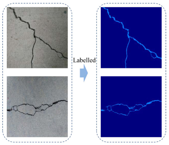 As a deep learning model, the DeepLab_v3+ needs network training prior to the designative detection task. In this study, 1200 crack images (1024 × 1024 pixels) were collected, and the “Image Labeler” toolbox was used to label these cracks (Figure 5). Among these images, 75% of them were used as training images, and the rest were used as testing images to evaluate the effect of crack segmentation.