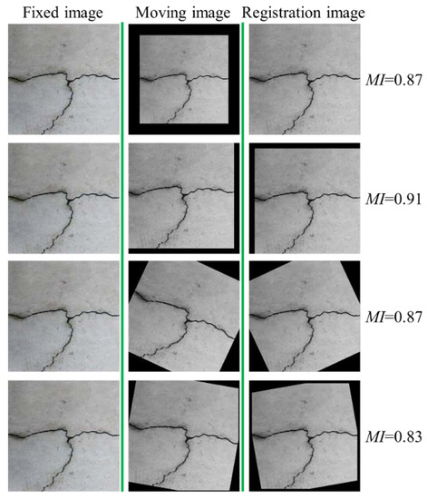 The pixel-level segmentation algorithm has been widely concerned for it can further improve the precision of defect information. It identifies the pixel distribution of the object, which can be used to analyze the object features (e.g., crack length, width, and area). Several kinds of neural networks have been developed to automatically implement pixel-level crack detection [18,19,20,21,22]. Compared with image classification and object detection, pixel-level segmentation is more effective and accurate in providing information about the distribution path and the shape of cracks. These advantages provide the potential for deeply extracting pixel-level quantifiable information of crack features. The latest version of the DeepLab_v3+ combines the advantages of the spatial pyramid pooling (SPP) and encoder–decoder structure [23]. It provides the excellent pixel-level segmentation method and has been successfully used for human and animal, skin and smoke detection [23,24,25]. In the field of SHM, the DeepLabv3+ has also been used to detect road potholes [26] and cracks [27] automatically, and its high detection accuracy has been verified. However, there is still a huge challenge in using intelligent algorithms for the automatic detection of crack images and identify and merge the different crack images captured at different views. It is difficult to ensure whether the camera is located at the same position [28,29]. Therefore, it is necessary to calibrate images in order to accurately obtain the crack change information of images from different perspectives. Image registration is an image processing technology that aligns two or more images of the same scene with respect to a particular reference image (fixed image), and it has been widely used in remote sensing [30], medicine [31,32,33], and other fields for its high precision.