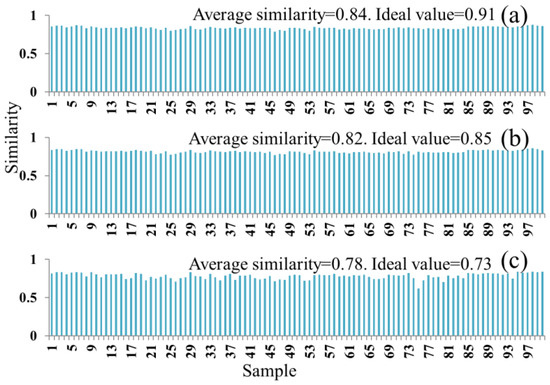 A total of 1100 moving images (sample library in Section 2.3) were aligned by the image registration technology, and their similarities related to the fixed mages were calculated. A part of the calibration results is shown in Figure 6. Detailed similarities of scaling, translation, and rotation images are exhibited in Figure 7, Figure 8 and Figure 9, respectively. Figure 10a,b show the registration similarity of the hybrid transform images (translation and rotation for Figure 10a and scaling, translation, and rotation, for Figure 10b). Due to the movement of the image, the black area in the calibrated image is lost. It can be summarized from the results that the fixed and calibrated images have a high similarity (the average similarity is higher than 0.8).