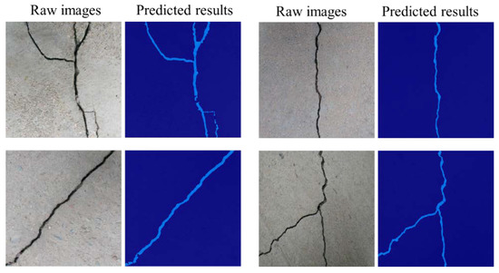 The detection results of five different DeepLab_v3+ networks ((‘resnet18’, ‘resnet50’, ‘mobilenetv2’, ‘xception’, and ‘inception-resnetv2’) used as the backbone network, respectively) are listed in Table 3. The ‘resnet50’ achieves the highest MIoU, accuracy, and F-score simultaneously; some detection examples are shown in Figure 11. Interestingly, the ‘mobilenetv2’ has the fastest computing speed at the expense of a small amount of precision. In the most extreme model, the ‘inception-resnetv2’ achieves the lowest accuracy and consumes a lot. Therefore, the DeepLab_v3+ adopting ‘resnet50’ as the backbone network was selected as the crack detection approach (named as: improved DeepLab_v3+).