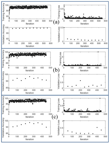 Training process of the DeepLab_v3+ using different gradient descent algorithms. (a) sgdm, (b) rmsprop, and (c) adam.