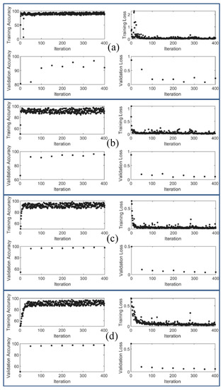 Training process of the DeepLab_v3+ using different learn rates. (a) 0.1, (b) 0.01, (c) 0.001, and (d) 0.0001.