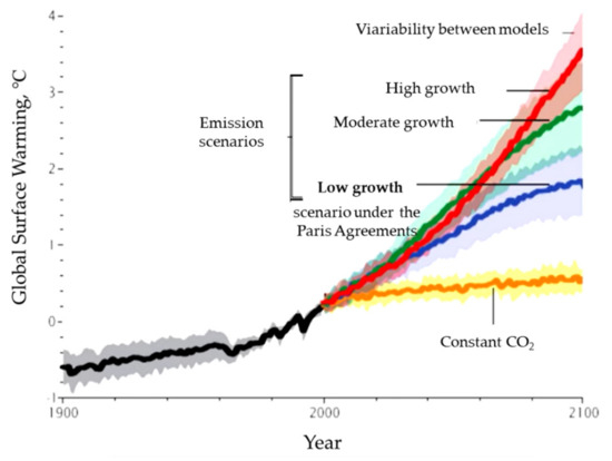 The low-growth-emission scenario is a scenario resulting from the Paris Agreement, i.e., limiting the average global temperature below 2 °C. A high-growth scenario can disintegrate the cryosphere. According to this scenario, by 2200, climate change may no longer be controllable [9,10].