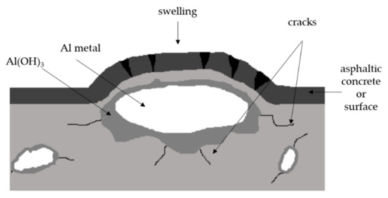 Despite the MSWIBA valorisation process, its use in building mixtures must be carefully considered due to the possible aluminium content. Metallic aluminium starts at a pH of 9–9.5. The aluminium content causes the mixture to swell through the evolution of hydrogen and Al (OH)3, which is described by Equation (1) and shown in Figure 4. The Al (OH)3 gel is the cause of the swelling [25,26,27].