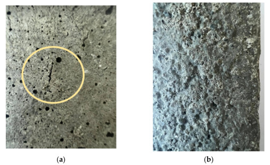 Damaged structure of geopolymer mix with the addition of MSWIBA: (a) swelling and crack surface; (b) bubbled surface.