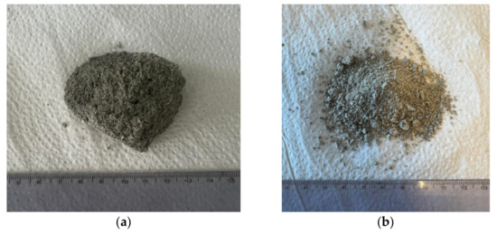 To check the leachability of the geopolymer mixture, an aqueous extract was prepared. The water extract was made in a proportion of 1:10 (1 portion of geopolymer and 10 portions of water). Then, it was shaken for 24 h in a dark container and then filtered through a filter. To compare leachability, the extract was made of a piece of geopolymer and a crushed geopolymer. Figure 8 shows the geopolymer samples that were tested for leachability.