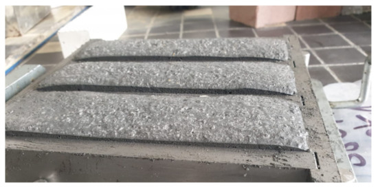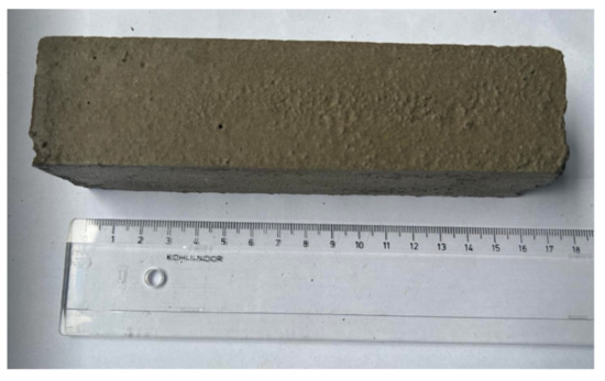 The size of each of the created mortar samples was 16 × 4 × 4 cm. An example of the geopolymer sample with MSWIBA is shown in Figure 11.