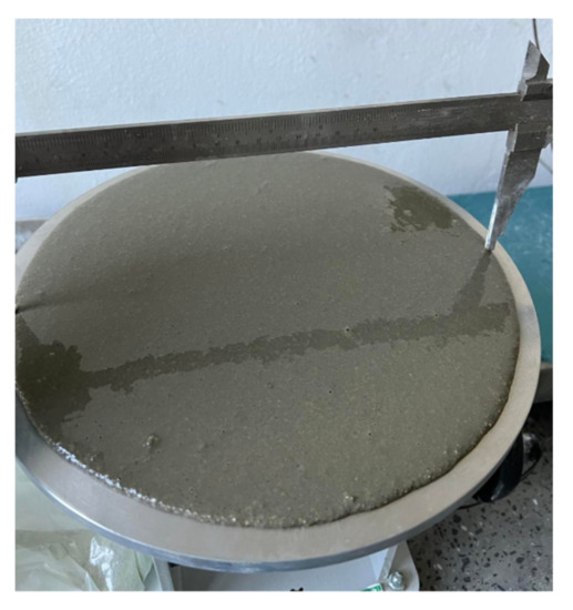 The consistency test indicated that the geopolymer was self-compacting. The spread was over 30 cm. Figure 10 shows the consistency test.