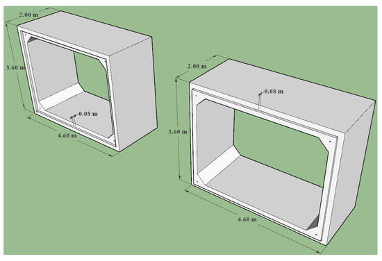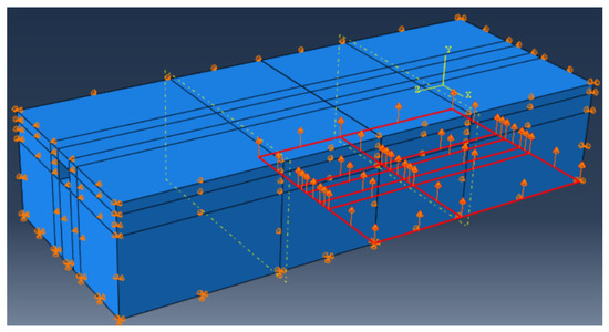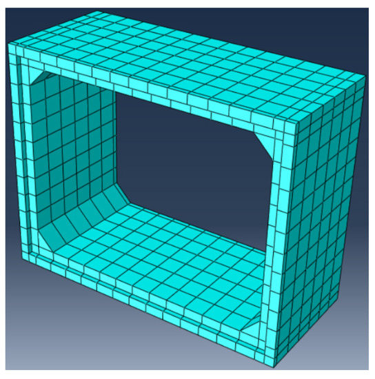 The three-dimensional schematic diagram of both ends of the single-section utility tunnel in the finite-element model is shown in Figure 1. The 50-section utility tunnel is taken as the research object, and the section spacing of the utility tunnel is set as 11 mm, according to the magnitude of prestress and the material properties of the rubber strip. The overall structure and size of the model when the utility tunnel crosses the fault plane at an angle of 90° is shown in Figure 2.