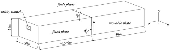 In recent years, with the acceleration of urbanization in China, the demands for electricity, communication, gas, and water have greatly increased, which have promoted development of long underground engineering structures, such as urban underground utility tunnels [1,2]. Owing to long construction periods and severe environmental impacts of the traditional cast-in-place concrete utility tunnels, prefabricated utility tunnels have been widely used in many cities in recent years [3]. Long-term waterproofing capability is usually the key goal of the design of the underground fabricated concrete structures, in which the waterproofing capability of the interface between the segments of the fabricated concrete structures is particularly important, and rubber strips are usually used in the design [4]. Underground engineering structures are inevitably affected by active faults [5]. Under the action of fault displacement, the contact pressure between the rubber strip and the interface of the utility tunnel decreases with an increase in the opening of the spliced joints of the utility tunnel, leading to a significant decrease in the waterproofing capacity of the spliced joints [4,6]. Therefore, it is necessary to understand the structural response characteristics of the fabricated utility tunnels under the action of fault displacement.