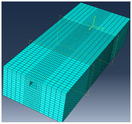 The overall boundary conditions of the model are set as shown in Figure 3, where the top surface is a free surface and the sides only constrain the normal displacement. The bottom of the fixed plate is completely fixed, and the vertical upward forced displacement is applied to the bottom of the movable plate to simulate the dislocation of the reverse fault. The meshing of the utility tunnel and the soil is shown in Figure 4 and Figure 5, and the soil around the utility tunnel and within a certain range near the fault plane is grid-encrypted to improve the calculation accuracy. In the process of model establishment, differences exist between the study reported in this paper and the author’s previous work [6], although only in the direction of applying forced displacement at the bottom of the movable plate, so for the specific model and the selection of relevant parameters, please refer to the previous work by the authors [6]. By comparing reference [6] with reference [24], it can be seen that no matter what kind of utility tunnel is studied, whether a stratified soil model is considered, or whether Flac 3D or ABAQUS software is used, the vertical displacement curve shape and the influence rules of fault displacement are basically the same, and the correctness of the model established from the side is verified.