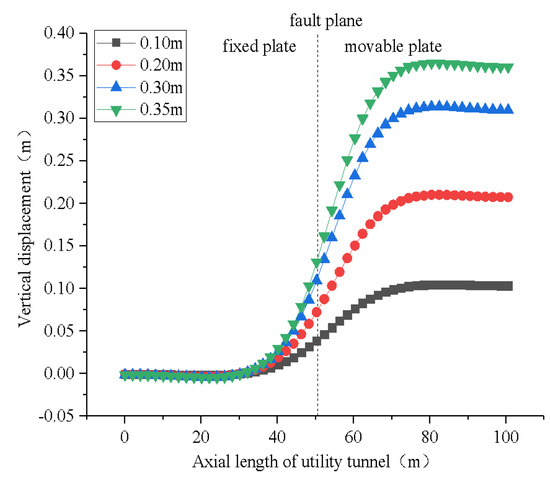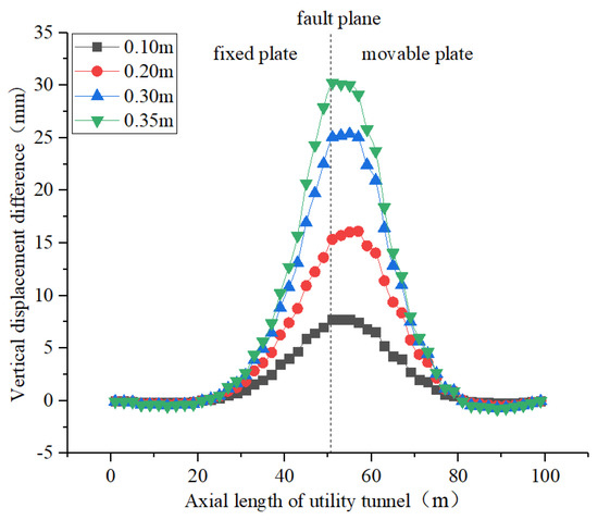 Figure 6 shows the distribution curve of the vertical displacement of the utility tunnel along the axial-length direction under different fault displacements. Figure 7 shows the distribution curve of the vertical displacement difference at both ends of a single-section utility tunnel along the axial-length direction under different fault displacements. According to Figure 6 and Figure 7, the vertical displacement and the vertical displacement difference increase with increasing fault displacement, and the differential settlement of the utility tunnel is more significant when the distance to the fault plane is shorter. Under a fault displacement of 0.35 m, the vertical displacement of the utility tunnel at the fault plane is 0.137 m, which indicates that the bending deformation of the utility tunnel in the movable plate is more significant, while there is a slight difference between the bending deformation of the utility tunnel on both sides of the fault plane under the action of a normal fault [6].