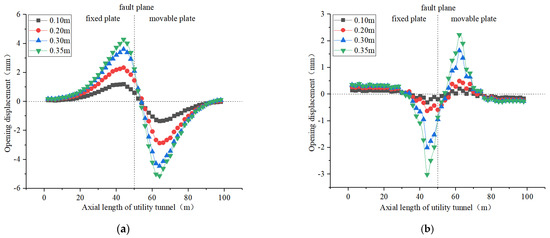 Figure 8a,b show the displacement distribution curves of the longitudinal horizontal openings displacement of the roof and floor of the spliced joints of the utility tunnel along the axial-length under different fault displacements. According to this figure, there is basically a positive correlation between the opening displacement and the fault displacement. A negative value indicates that the opening displacement increases and the waterproofing capacity decreases. Because of these observations, this section and the sections that follow only analyze the negative part of the opening displacement. At a position 6 m from the fault plane in the fixed plate, the opening displacement of the floor reaches the maximum values: 0.300, 0.631, 2.006, and 3.017 mm; at a position 14 m from the fault plane in the movable plate, the opening displacement of the roof reaches the maximum values: 1.343, 2.877, 4.465, and 5.133 mm.