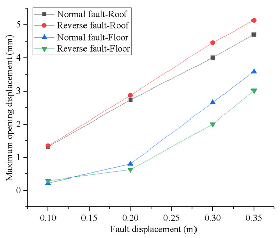 Figure 9 shows the relationship between the maximum opening displacement and fault displacement under the action of a normal fault [6] and a reverse fault. According to this figure, within the fault displacement range 0.10–0.35 m, the maximum opening displacement of roof under the action of a reverse fault is greater than under the action of a normal fault; for the floor, the maximum opening displacement under the action of a reverse fault is smaller than under the action of a normal fault, except for a fault displacement of 0.10 m.