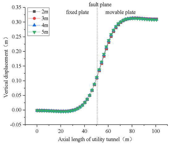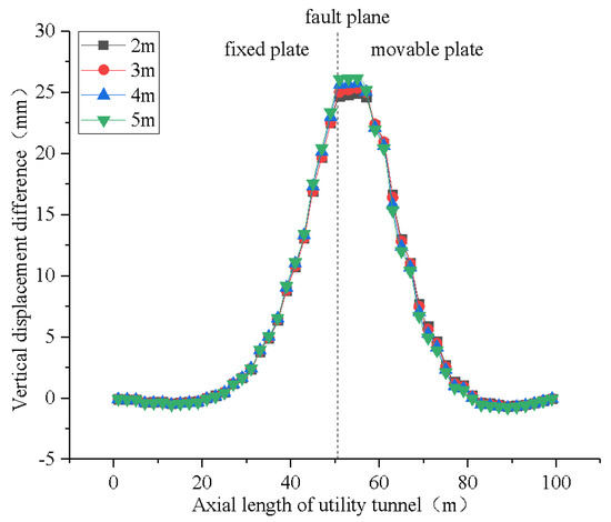 Figure 10 shows the distribution curve of the vertical displacement along the axial-length direction of the utility tunnel under different burial depths. Figure 11 shows the distribution curve of the vertical displacement differences at both ends of a single-section utility tunnel along the axial-length direction under different burial depths. According to Figure 10, small-scale changes in burial depths have minor effects on the vertical displacement of the utility tunnel under the action of reverse faults. According to Figure 11, the vertical displacement difference increases with increasing burial depth at a position close to the fault plane. This difference is not significant, however, and the maximum difference under different burial depths is 1.39 mm. In general, small-scale changes in the burial depths may have minor effects on the overall deformation of the utility tunnel structure under the action of reverse faults.