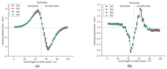 Figure 12a,b show the distribution curves of the longitudinal horizontal openings displacement of the roof and floors of the spliced joints of the utility tunnels along the axial-length direction under different burial depths. According to Figure 12a, the opening displacement of the roof near the fault plane roughly increases with increasing burial depth. The maximum opening displacements under burial depths of 2, 3, 4, and 5 m are 4.261, 4.465, 4.538, and 4.632 mm, respectively. According to Figure 12b, the opening displacement of the floor near the fault plane has no regularity. The maximum openings under burial depths of 2, 3, 4, and 5 m are 2.153, 2.006, 2.004, and 1.975 mm, respectively. The reason of this phenomenon may be when the burial depth increases, the load on the top of the utility tunnel increases, and at the same time, the constraining force of the soil on the utility tunnel also increases.
