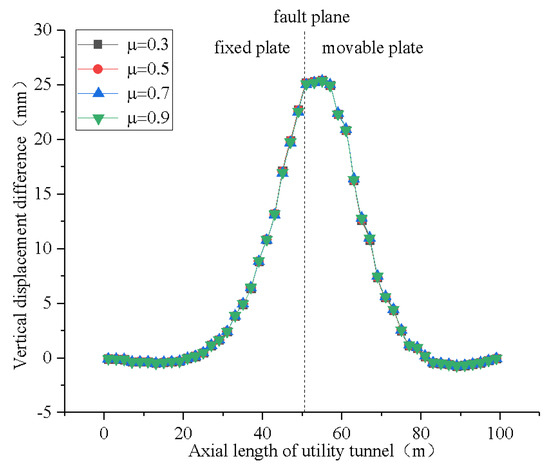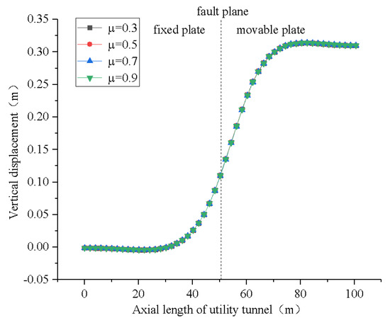 Figure 13 shows the distribution curve of the vertical displacement of a utility tunnel along the axial-length direction under different utility tunnel-soil friction coefficients. Figure 14 shows the distribution curve of the vertical displacement differences at both ends of a single-section utility tunnel along the axial length under different utility tunnel-soil friction coefficients. According to Figure 13 and Figure 14, there is almost no difference in the vertical displacement and the vertical displacement difference under different utility tunnel-soil friction coefficients. The maximum difference in the vertical displacement difference under different utility tunnel-soil friction coefficients is 0.16 mm. In general, the change in utility tunnel-soil friction coefficient may have little effect on the overall deformation of the utility tunnel structure, and a similar phenomenon was also found in a pipeline [27,28].
