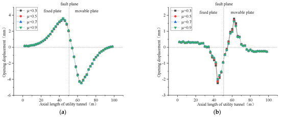 Figure 15a,b show the distribution curves of the longitudinal horizontal opening displacement of the roof and floor of the spliced joints of a utility tunnel along the axial-length direction under different utility tunnel-soil friction coefficients. According to Figure 15a, varying the utility tunnel-soil friction coefficient has little effect on the opening displacement of the roof, and the maximum difference in the opening displacement under different utility tunnel-soil friction coefficients is 0.083 mm; According to Figure 15b, in the proximity of a fault plane, although the opening displacement of floor generally decreases with increasing utility tunnel-soil friction coefficient, this effect is insignificant. The maximum difference in the opening displacement under different utility tunnel-soil friction coefficients is 0.249 mm.