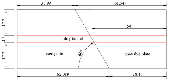 The crossing angles between the underground structures and the fault planes vary in practical engineering, and the structural responses under different crossing angles have differences [21]. This section analyzes the deformation of a prefabricated utility tunnel when the crossing angles are 45°, 60°, 75°, and 90°. Under this, then, the limiting condition is that the fault plane and the mid-span of the pipe gallery intersect at the same position when the model is being established. The model size, when the utility tunnel and a fault plane are obliquely intersected at 60°, is shown in Figure 16.