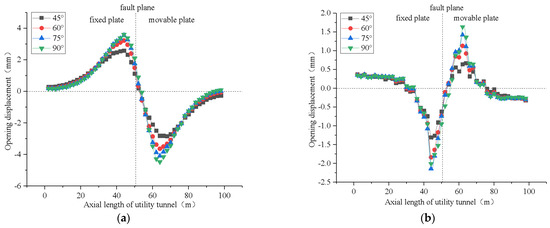 Figure 19a,b show the distribution curves of the longitudinal horizontal opening displacement of the roof and floor of the spliced joints of a utility tunnel along the axial-length under different crossing angles. The opening displacement of the roof and the floor is positively correlated with the crossing angle at the position close to the fault plane, and is negatively correlated with the crossing angle at the position away from the fault plane to a certain extent. For the floor, the opening displacement under the orthogonal condition (90°) does not meet the above regularity in some positions. The maximum difference in the roof opening displacement under different crossing angles is 1.80 mm, and the maximum difference in the floor opening displacement is 0.99 mm. When the crossing angle increases from 45° to 90°, the maximum opening displacement of the roof reaches 2.833, 3.628, 4.087, 4.465 mm, and the floor reaches 1.303, 1.833, 2.135, and 2.006 mm. At the same axial position, it can be considered that the closer the crossing angle is to 90°, the difference in the opening displacement of the roof and the floor under different crossing angles is smaller.