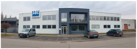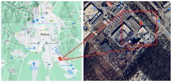 The building is located in the built-up area of Košice—Nad Jazerom (Figure 1). The building is used for administrative purposes for the company ABC KLÍMA KOŠICE s.r.o. The main entrance to the building is directly from the street. In front of the building is a parking lot for employees. Behind the building is a concrete area, which is used for parking company cars and storing oversized materials. Near the building, there is a grocery store, bakery, and car bazaar. On the other side of the road is a garden area.