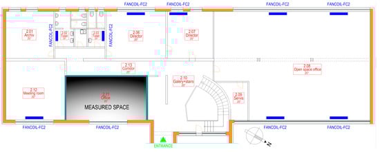 On the first floor after passing through the vestibule, there is a gallery with a staircase on the right side. On the second floor where the monitoring of the indoor environmental quality factors were carried out, offices for employees, directors, designers, and project managers, as well as archives and toilets, are placed. Figure 3 depicts the floor plan of the 2nd floor with marked measured space and orientation to the world side.