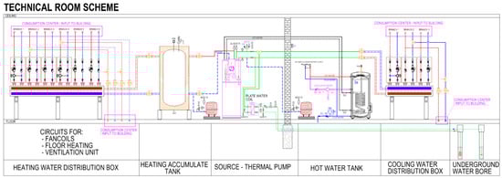 The heating system and the cooling system are shown using the functional scheme of the system connection (Figure 4). The system includes a heating water distribution box (6 circuits) for the heating system (left side of the diagram) and an accumulation tank for accumulating the heat produced by the heat pump. The system also includes a cooling water distribution box (3 circuits) for the cooling water system (right side of the diagram). The source of hot and cold water for the system is a water-to-water heat pump. The source of cold water can also be a separate water supply from a well, which allows us to ensure a direct supply of cold water to the cooling system and save the heat pump or in the event of a heat pump failure. The hot water tank is in the functional scheme of the system connection to complete the diagram, but it does not affect the heating and cooling system and of course was not part of the measurements.