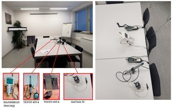 Measurements of air temperature, relative humidity, air velocity, and CO2 concentrations were performed using a Testo 435-4 measuring instrument with appropriate probes (Testo 435, Testo AG, Lenzkirch; Germany). All measuring instruments were placed approximately in the middle of the room on the table. The high of the table was 0.75 m, and this height represented the breathing zone of the sitting person. The measured values were recorded in 1 min intervals.