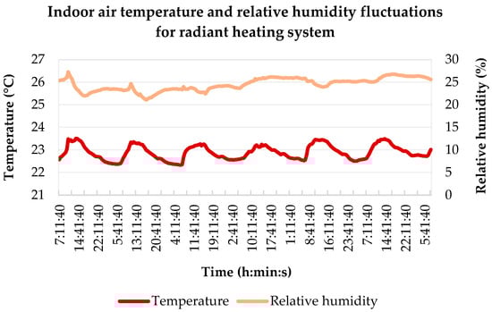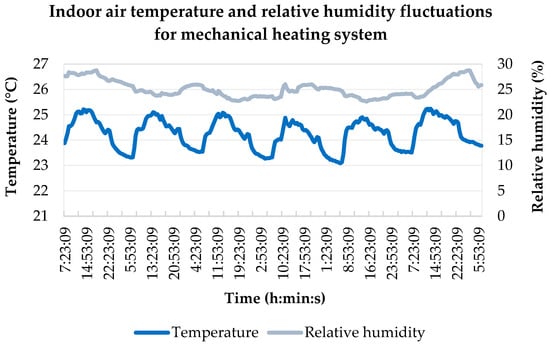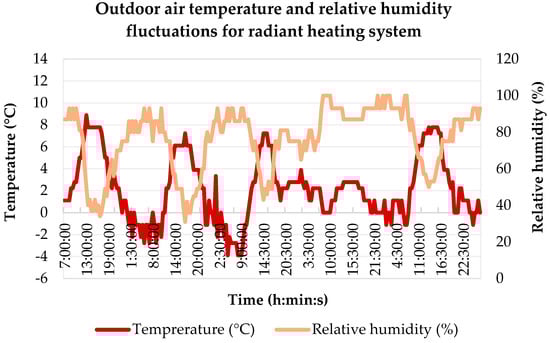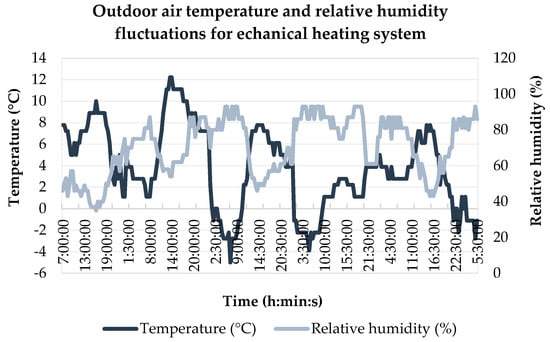 Figure 6 and Figure 7 show that in the case of both heating systems, the values of the measured indoor temperatures fluctuated considerably, with a daily tendency to increase in the morning and gradually decrease in the afternoon and evening. In the case of the mechanical heating system, an increase in indoor temperatures of approximately 5.6% was recorded compared to that with the radiant ceiling heating system. The minimum measured value of the indoor air temperature during radiant heating reached the value of 22.33 °C and the maximum value of 23.51 °C. On the other hand, the lowest measured air temperature with a mechanical heating system was 23.09 °C, and the highest was 25.24 °C. The relative humidity values of the two heating systems did not fluctuate significantly and were mostly similar, ranging from 21.06% to 27.27% for the system with active radiant heating and from 22.61% to 28.8% for the system with mechanical heating. However, none of the heating systems met the legislative requirement according to which the values should be in the range of 30–70%. With regard to the values of the air flow velocity, the permissible legislative limit of 0.2 m/s was not exceeded during the entire monitoring period. A higher air velocity was recorded with the mechanical heating system. Figure 8 and Figure 9 show the outdoor temperature and humidity for each of the monitored heating system [].