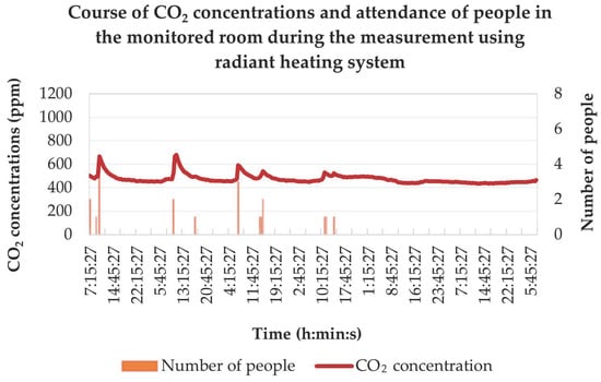 As can be seen on Figure 10 and Figure 11, the increase in CO2 concentrations occurred, just when the employees were in the monitored room. In the absence of people in the room, CO2 concentrations for both heating systems ranged from approximately equal levels, ranging from about 400 to 500 ppm. During both measurement periods, the CO2 concentration values were kept below the Pettenkofer recommended limit value of 1000 ppm []. A sharp increase of CO2 concentration to 1002 ppm was recorded only during one day, when the room was heated by the fan coil, due to the presence of people in the room for a longer period of time. The subsequent decrease in CO2 concentrations back to the original level indicated the treatment of air by air conditioning.