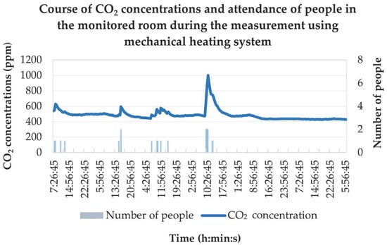 Course of CO2 concentrations and attendance of people in the monitored room during the measurement using MHS.