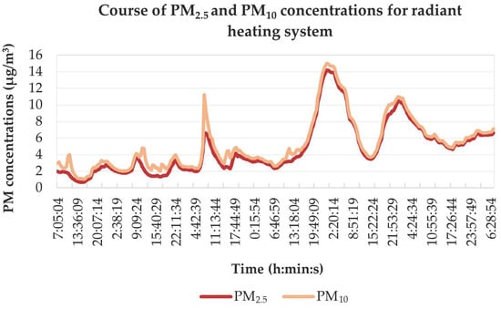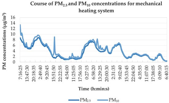 It should be pointed out that the recorded course of concentrations was fluctuating for both systems. Visible increases in PM2.5 and PM10 concentrations were observed in the case of radiant ceiling heating, especially on the fourth day of measurement, when PM concentrations reached the maximum. The highest concentration in the case of mechanical heating was measured at the beginning of the measurement, but with this mode of heating the measured values did not tend to increase as with radiant heating. The total average concentrations of PM2.5 and PM10 of both heating systems achieved comparable results.
