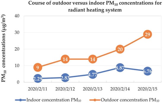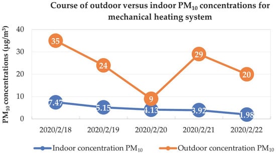 Table 6 presents I/O ratios for PM2.5 and PM10 concentrations during radiant and mechanical heating. The ratio values between indoor and outdoor (I/O) concentrations have been widely used to study the relationship between indoor and outdoor concentrations of pollutants []. The I/O ratio was less than 1 during all measurement days, which meant that the amounts of PM2.5 and PM10 concentrations in the outdoor environment were higher, so they can be a source of PM in the indoor environment of buildings. The I/O ratio for PM2.5 ranged from 0.02–0.2 and that for PM10 ranged from 0.2–0.44 for RHS. The I/O ratios of PM2.5 and PM10 ranged from 0.03 to 0.16 and from 0.01 to 0.46 for MHS, respectively. The results showed that the room ventilated by a central air handling unit using the filter technology with high-efficiency (more than 99%) achieved low I/O ratios. Therefore, outdoor PM concentrations should not affect the level of PM occurrence in the indoor environment. In the study of Burdova et al. [], aimed at the monitoring of an air-conditioned university library also in Kosice, Slovakia showed that the I/O ratios of PM10 are within the range of 7.1–31.43 which are higher by 97.2–98.6% for RHS and 98.5–99.8% for MHS compared to the results of PM10 in this study, and the authors proposed to design high-efficiency HEPA filters with an efficiency of up to 99.97%. This present study also confirmed the need of using filters with the highest level of separation. It should also be noted that regular care and replacement of filters must be taken care of, so that the filters do not become the source of pollutants. This study also points to the necessity of using fresh air units with a stream of fresh air. Combining this measure with a suitable heating system can significantly contribute to reducing PM concentrations. Radiant heating is the method with the lowest level of air and dust swirling. Mechanical heating can be characterized as a heating with a higher risk of air swirling and dust spreading but is often used due to the possibility of bringing fresh air into a ventilated room with occupants.