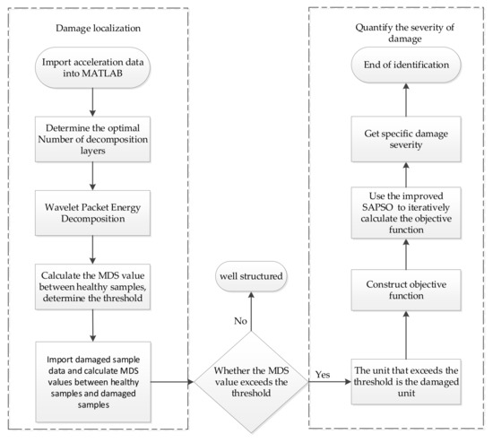 Using the improved HTF-SAPSO algorithm in this paper, Equation (14) is solved and optimized, and the damage severity of the structure is calculated. The basic process of the research method for damage identification based on WPE-MDS and HTF-SAPSO is portrayed in Figure 3. The main steps are as follows: