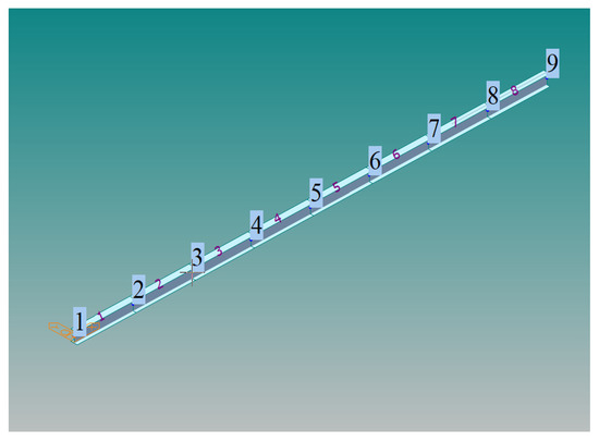To preliminarily verify the feasibility of bridge damage location and damage severity identification based on the WPE-MDS method, this section establishes the I-beam for numerical simulation analysis and calculation, and establishes the finite element model of the I-beam, which is portrayed in Figure 4 and based on MATLAB platform. The beam has a total length of 5 m and is divided into 8 elements using 9 nodes, each of which is 0.625 m in length. The element used is a 2-Node 6-DOF element with an elastic modulus of 206 GPa, a cross-sectional area of 0.0014 m2, and a cross-sectional moment of inertia of 2.45 × 10−6 m4. We defined the element stiffness matrix and the element mass matrix and used them to assemble the global stiffness matrix and the global mass matrix. Finally, the dynamic response of the structure is calculated by the Newmark method.