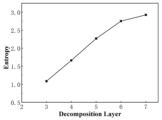 When determining the optimal number of decomposition layers, it is necessary to start the search from the top layer of the wavelet packet tree. If the loss function of a parent node is greater than the sum of the loss functions of its two child nodes, it means that the decomposition of this layer can decompose the original signal into more regular sub-signals, the energy is more concentrated, and the provided feature information contributes greatly. Conversely, if the sum of the loss functions of the two sub-nodes is greater than that of the parent node, it means that the signal is over-decomposed. Because the entropy value of the signal becomes larger after the decomposition (that is, the disorder degree of the signal becomes larger), the energy becomes scattered, which is not as great as the contribution of the feature information provided before the decomposition. We traversed all the node loss function values under the decomposition of each layer. When the sum of the loss function values is the smallest, the decomposition of this layer is the optimal number of decomposition layers.